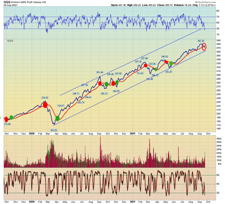 An important technical view of the disturbing US stock market action. I’ve urged stock market investors to pay attention to my powerful red and green traffic light signals for the Nasdaq QQQ ETF.