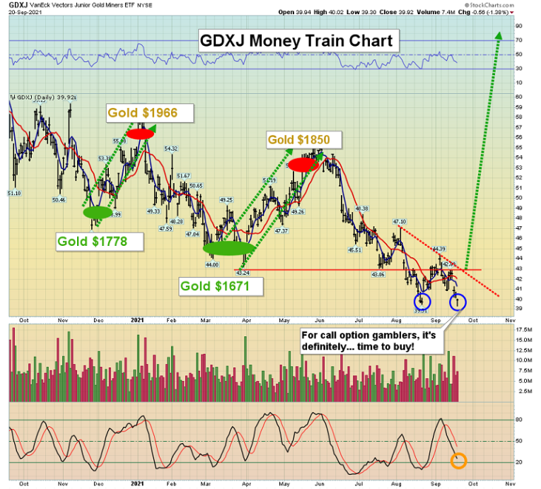 The exciting “money train” chart. GDXJ may be poised to begin its biggest rally in its history.
