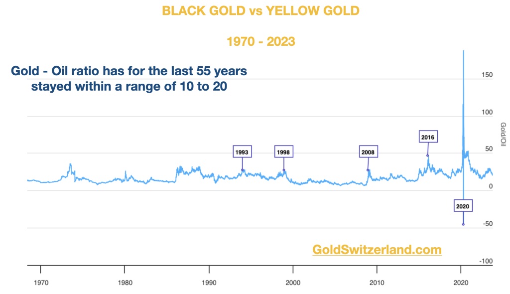 Oil and gold are best friends. As the chart of the Gold – Oil ratio for 50 years shows, below, gold and oil move very much in tandem within a narrow range. So if oil now goes up due to the Middle East crisis, gold will follow.