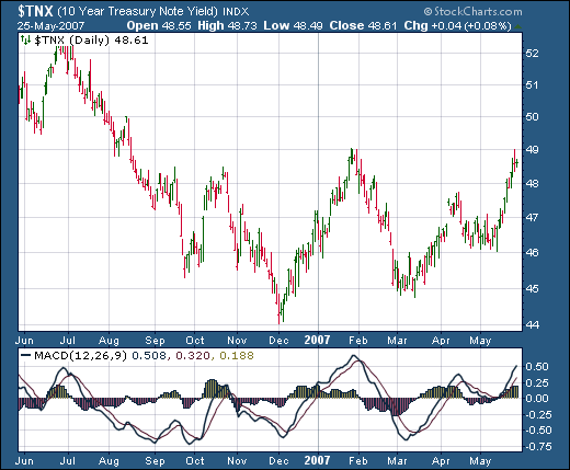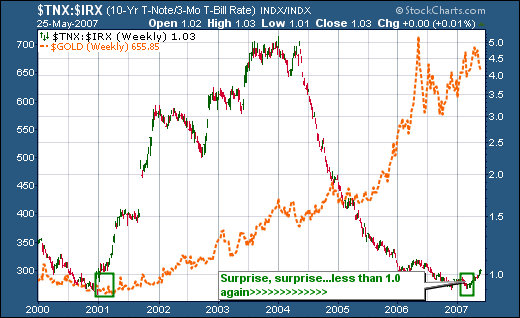 The upshot of the TNX/IRX yield ratio equal to less than 1.0 suggests gold has just begun a new leg up, which may propel it well past its historic high of $850 (January 1980). In fact my interpretation of related TA tells me a new record POG high may be made sometime in 2008 -- somewhere in the neighborhood of $900-$950/oz.