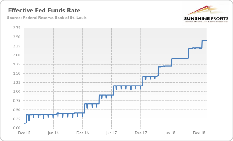 The similarities to 2015/2016 should now be obvious. The S&P 500 Index plunged about 16 percent in December 2018 (however, it partially rebounded since then). The Fed hiked interest rates that month, but it sent a clear dovish message, suggesting that it could be patient with further hawkish moves. So far, the price of the yellow metal jumped about 5 percent since December 2018.