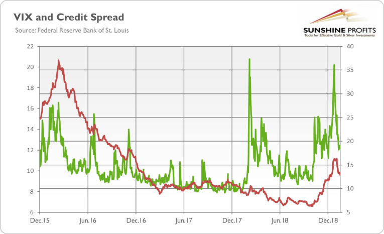 To sum up, making analogies is tempting, as this is how we learn about the world. However, investors should watch out for false analogies, as they could result in losses. True, in 2016, there was a strong rally in precious metals, but it was triggered by the fear trade. Surely, both the stock market volatility and credit spreads also increased at the end of 2018, as the chart below shows.