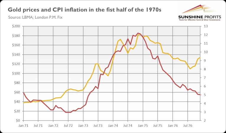 Everyone says that the upcoming recession and stagflation will be good for gold. However, will they really? Some doubts also arose in my mind, so let’s investigate them. I, of course, don’t dispute that gold soared in the 1970s. This is a fact which is illustrated nicely by the chart below.