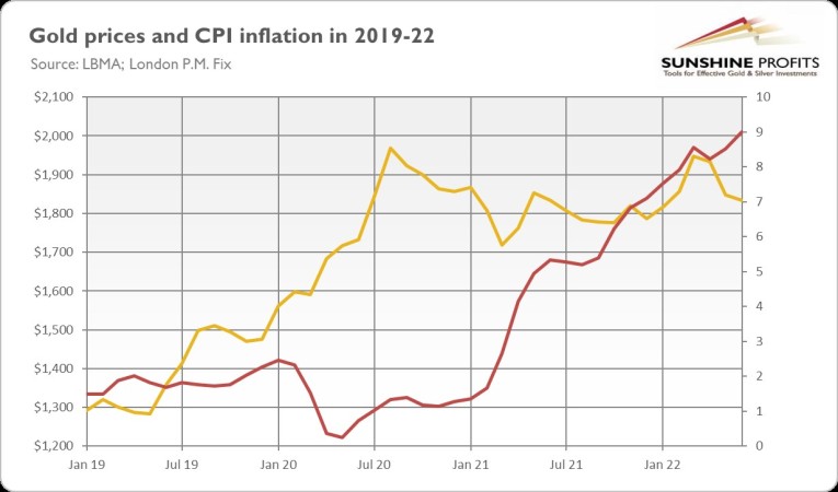 However, history doesn’t repeat itself (though it often rhymes). As the chart below shows, gold hasn’t actually surged with the current inflation. The rally occurred in the first half of 2020 amid the coronavirus recession when both actual inflation and inflation expectations initially plunged. Hence, the peak in inflation doesn’t have to be detrimental to gold. After all, what didn’t rise can’t fall.