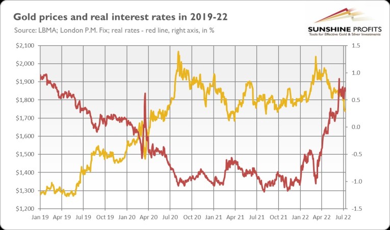 What’s more, real interest rates have already surged (see the chart below), so the room for further movement is limited. Of course, they can always go up, but the risk of a spike similar to that seen in 1980-1981 is much lower, especially given the recessionary worries and their dampening impact on rates.