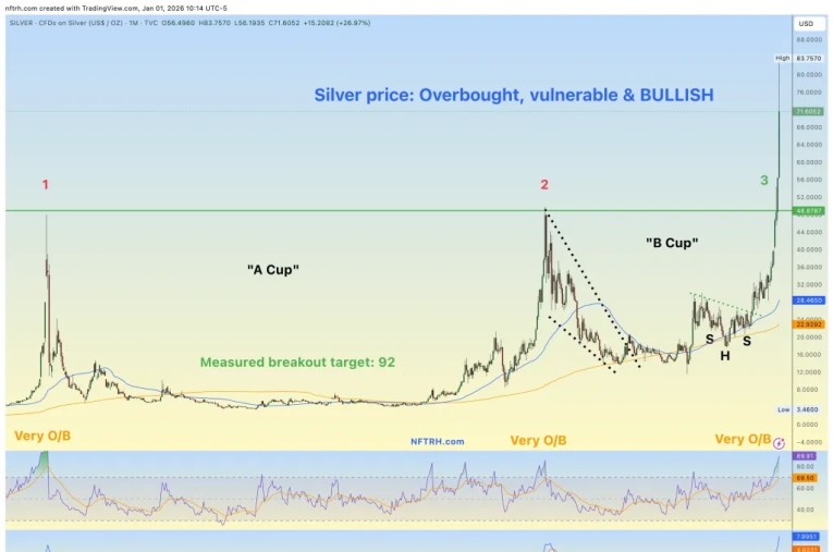For now, nothing has changed. Silver is on a hysterical and parabolic move, and the Gold/Silver ratio’s downside extreme indicates a coming end to the move. It could happen tomorrow or next week or in January or February. It could happen above $100/oz. or right here at $79. But it is very likely coming.