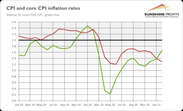 Having said that, investors should remember about two things. First, inflation doesn’t have to be helpful for gold prices, if it triggers expectations of a more hawkish Fed. In such a scenario, the rise in the bond yields may outweigh (at least initially) the positive factors. However, the Fed is going to tolerate higher inflation, so it’s likely that the federal funds rate will stay behind the inflation curve.