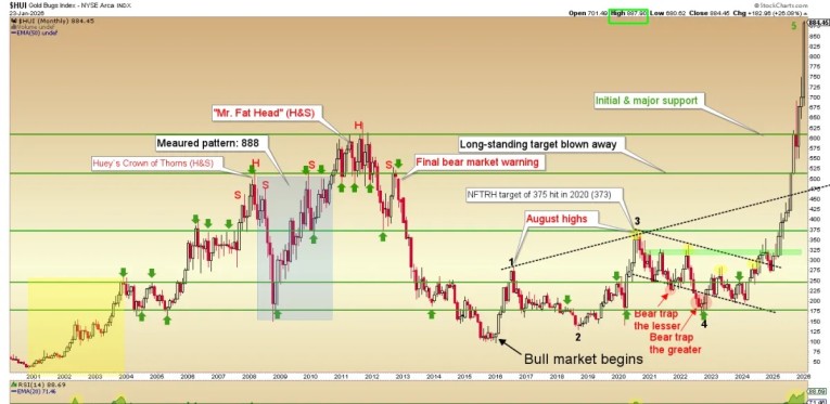 Wow, who would have thought? Well, most gold bugs, including myself. But then came all those dreary years of learning lessons like the failed HUI 888 target above and even more importantly, lessons about why it failed (due to the mechanics of the brilliantly evil Bernanke era’s new and innovative ways of inflating the system to positive economic appearances).