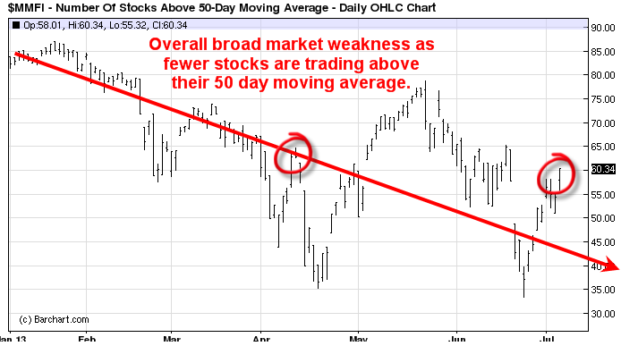 Here we can see that while the SP500 has been rising over the past 6 months less stocks are trading above their 50 day moving average. This means a smaller group of stocks is holding the market up and it’s just a matter of time before those stocks burn out and roll over also.