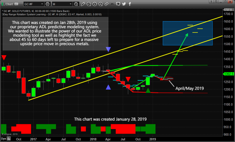 Back in early October 2018, we shared this chart with all of our followers suggesting that Gold and precious metals would rally to above $1300 near December/January using our Adaptive Dynamic Learning predictive modeling system. We've been suggesting to our followers for many months that Gold, Silver, and miners would begin a new upside price swing, yet we knew the big breakout moves were still many months away.