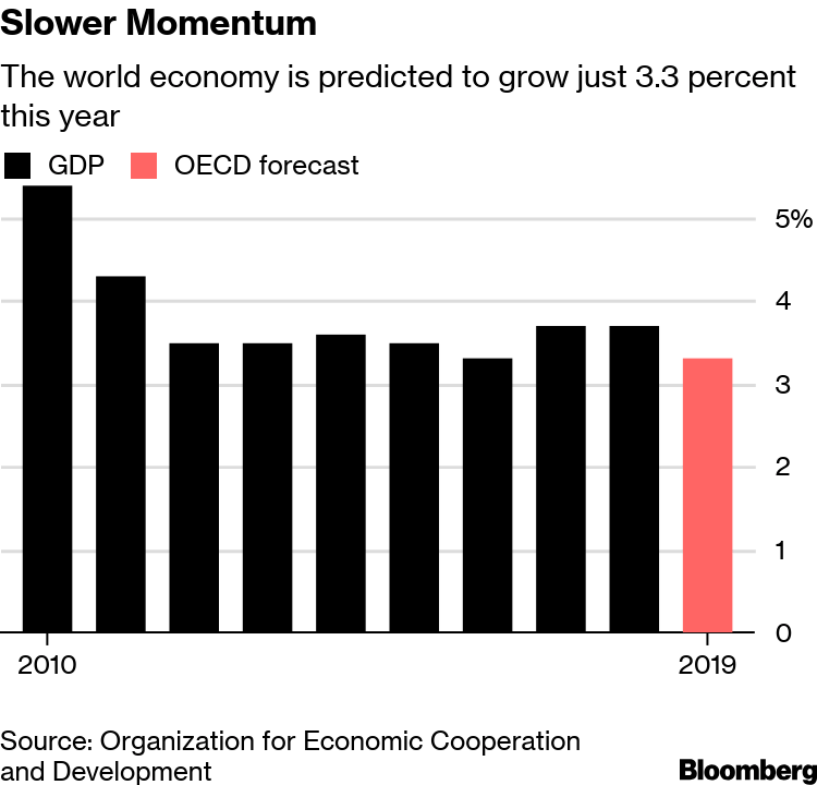 The stresses have prompted repeated forecast downgrades by governments and other authorities. On Tuesday, the World Trade Organization slashed its 2019 trade projection to the weakest in three years. The OECD cut its economic forecast last month and warned of downside risks that could mean an even worse outcome.