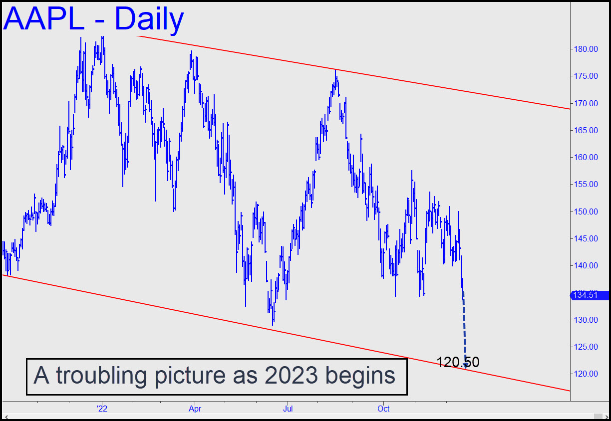 The modest bear market rally begun in October likely ended last week when stocks turned sharply lower after failing to achieve clear 'Hidden Pivot' rally targets. Now, if the selling should continue to exceed minor abcd targets as occurred last week, that would affirm that Papa Bear is back. AAPL in particular, the world's most valuable stock, took a dive that has another 10% to go before good support is likely to materialize near $120 (see chart, above).