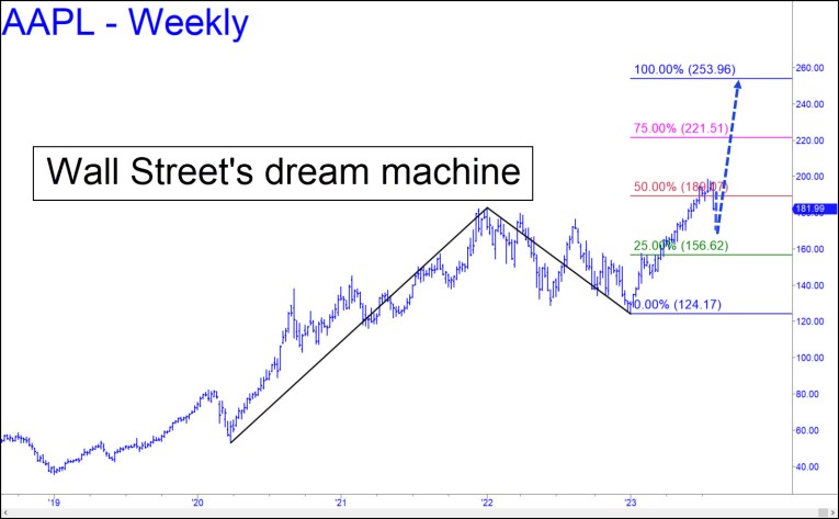 Last week’s commentary said the first big correction of 2023 had a ways to go, and that is still the case. If there were any doubts about this, Apple’s swan dive Thursday on punk Q2 earnings released after the close should have dispelled them. The most valuable stock in the world fell by nearly 5%, shrinking the global ‘wealth effect’ by around $144 billion. This is unlikely to weigh on yacht sales as summer heads into the final turn, but it could impact them eventually if the stock, and few others favored by portfolio managers, fall to the worst-case targets on some of my charts.