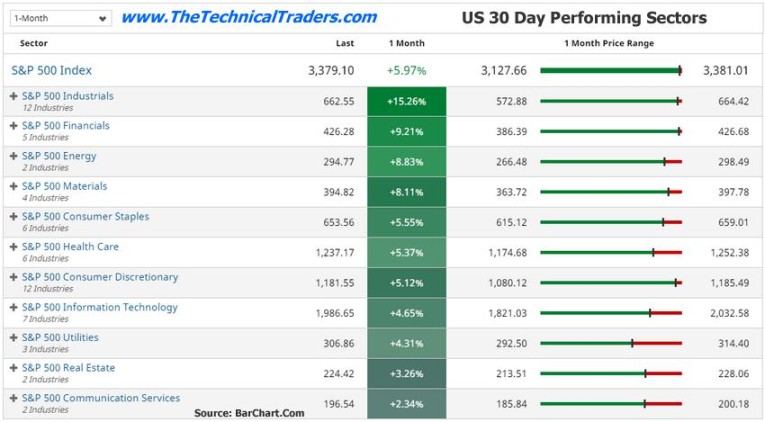 Recently, a moderately large shift away from Technology and Biotech has taken place where traders and investors have started to move capital away from these high-flying sectors and into more traditional market sectors like the Industrials, Financials, Energy, Materials amongst others. This type of shift takes place when traders and investors believe a consumer-based economy will dominate essential components within the markets and when technology or price speculation has driven stock price levels to near extreme levels. Take a look below for a list of the top-performing sectors over the last 30 days.