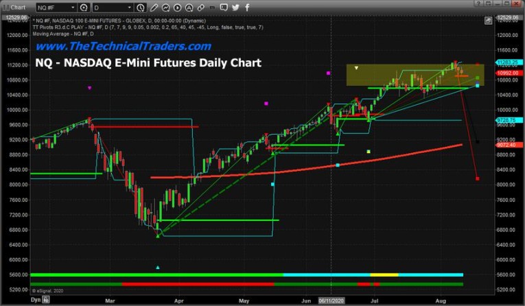 Our proprietary Fibonacci Price Modeling system assists us in learning where and when price levels have reached critical turning points and nearing exhaustion points The NASDAQ Daily chart below highlights our Fibonacci Price Modeling system. It shows a YELLOW Rectangle that spans the range of the upside Fibonacci projected price expansion level from the lows in late June 2020. Notice how price rallied above the 10,600 price level in mid-July, then began to weaken and rotate between 10,600 and 11,300. The projected Fibonacci Price Expansion levels suggested price would attempt to move into this range as the main Resistance area. Of course, price could continue to rally beyond these ranges in strong momentum – which we've seen in the past.