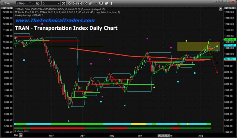 This next chart, the Transportation Index Daily chart, also suggests that price levels have already breached the Fibonacci Projected Price Expansion levels. As such, the Transportation Index may have already breached key resistance – pushing into a Scouting Pattern type of price formation. This is where price attempts to “scout out” a price area that is somewhat “alien” to normal price ranges. If strong support if found above this resistance level, then prices will hold above the resistance level and attempt to move higher. If support is not found in the scouting area, then price will almost immediately fall back into the resistance area and consolidate or initiate a new downside price trend.