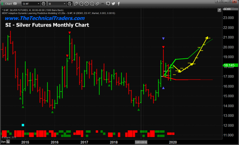 This first Monthly Gold ADL chart highlights the ADL predictive modeling systems suggestion related to future price targets. We can see the upside move in Gold should begin with an upside target near $1600~1625 over the next 60+ days. After that, the rally should accelerate higher in April/May 2020 with another move higher towards $1700~1725. By August/September 2020, Gold should attempt a rally to levels above $1800~1850 and then begin to consolidate above $1800 for a few months.