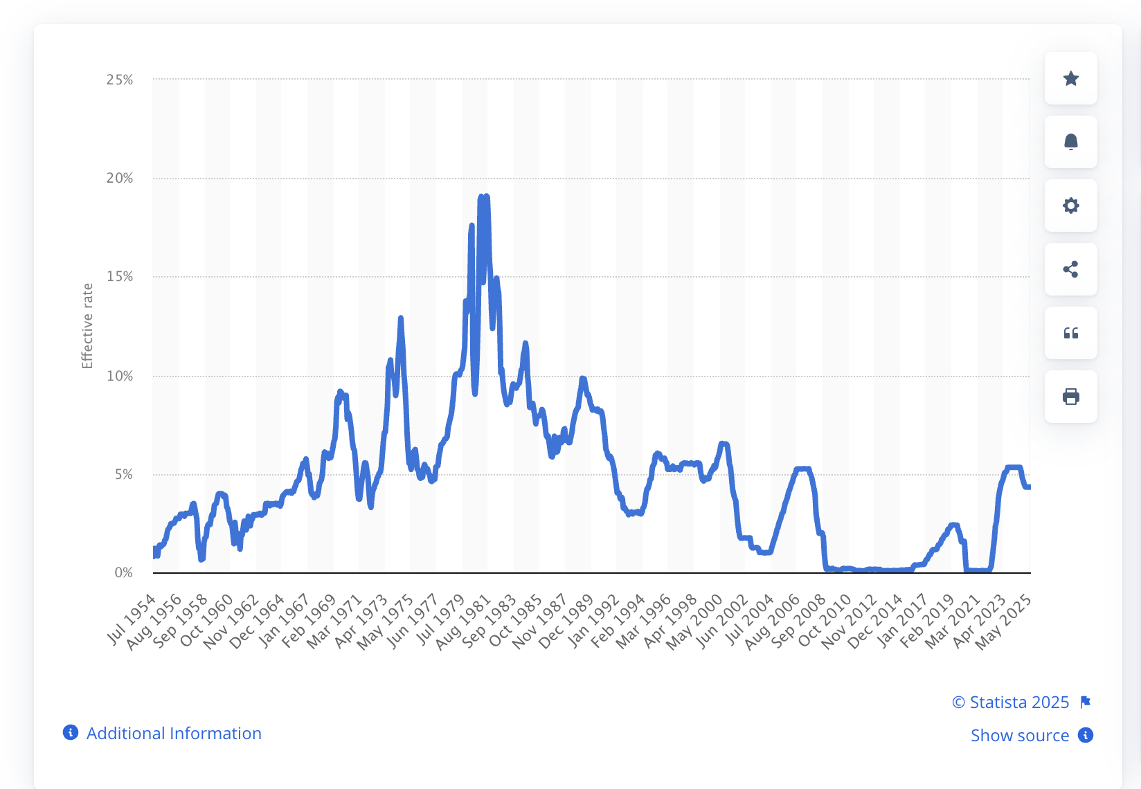 You can also clearly see a general downward ratchet effect in rates over time. Each interest rate peak preceding a bust gets lower as the economy has become more addicted to easy money.