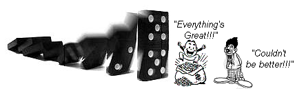 Combining the fundamental lack of real earnings with ridiculously-stretched technical measures, the S&P is the most overbought I've ever seen it, money managers playin' loose and fast with their clients' cash, on the threshold of the "Look Ma! No earnings!" crash. Or perhaps within the ensuing whining 'twill go down as the "They Didn't Tell Us The Truth!" crash: that would fit in nicely with the declining Economic Barometer at which we'll shortly look. You may have even seen the Reuters piece this past week that "U.S. investors are not rewarding companies for generating good earnings consistently, opting instead for a stockpicking strategy that might be called 'growth at a high cost.'" Like one's entire savings? Either way, in the spirit of last week's missive wherein we brought back one of our dire domino sets, let's bring back another as well: