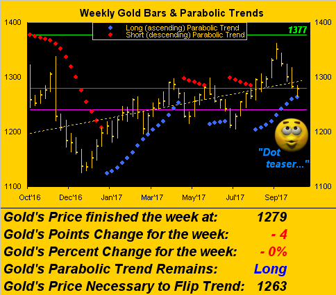 At present for gold, we turn to the weekly bars and see the ascending parabolic Long trend now getting teased by lowering price nine weeks into the blue dots' upside run. As stated in the graphic, a move in the ensuing week below 1263 and that trend flips to Short. True, gold did well in rebounding 16 points off Friday's low to practically sit back atop the 1280-1240 box. Still, we know Octobers past on balance have not been not friendly for gold. The gauntlet has thus been thrown for King Gold to rise to the month's challenge; (and a stock market crash would give it that chance):