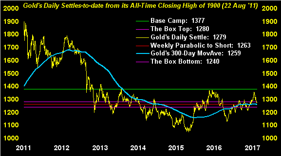 Next we've gold's daily closes from the All-Time Closing High of 1900 some six years ago. The various horizontal measures along with the almost flat 300-day moving average show us just how "boxed in" price has become when revisiting this area time and again. Still, the overall trend from the lows of 2015 remains up: