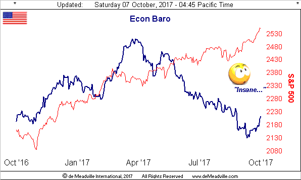 Squire, as you know, the Baro tends to oscillate more than trend endlessly in the same direction: a good example of that is when (to coin an old economic adage) "things are getting worse more slowly", such conditions can cause the Baro to rise. Moreover, there were some good turn-around reports which came in this past week, despite the hurricane-affected loss in non-farm payrolls of 33k. To wit: September's Hourly Earnings sported a spritely gain from August's 0.2% growth to 0.5%; the Unemployment Rate fell from 4.4% to 4.2%, (albeit there's the uncounted folks dropping from the workforce which can belie that measure); the Institute for Supply Management's readings for both manufacturing and services increased; vehicle sales marched higher; and for August there were whirl-around changes from negative to positive in both Factory Orders and Construction Spending. Thus we've that most recent rise in the Econ Baro.