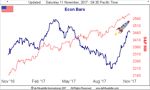 Now having noted a week ago the brilliant move by the Bank of England in raising their Official Bank Rate as the economic outlook for the United Kingdom dims, the opposite seems the case across the channel with EuroZone expansion expectations being again ramped up, this time to 2.2% toward a ten-year best. Possibly the rocketing pitch of the StateSide economy is passing across the pond? Here's our Economic Barometer for the past year along with the S&P (red line):
