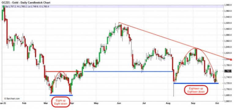 Check the incredible symmetry on the chart below. In our September Precious Metals Projections video, Chris Vermeulen and I projected that COMEX gold might soon form a massive double bottom, similar to what it painted in March of this year. As you can see below, that appears to have happened and the similarity in duration and scope is remarkable.