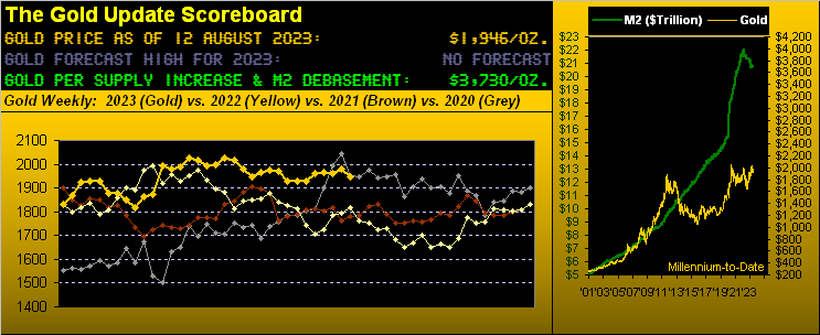 In the interim (short or long as it may be) what we can below see are the 10-day Market Profiles for Gold on the left and for Silver on the right. Therein we’ve present prices (Gold 1946 and Silver 22.75) buried at their respective bases. Moreover as noted in Gold’s aforeshown weekly bars, the Gold/Silver ratio is now 85.5x, the highest week-ending level since that on 23 June (86.0x). Again from the “Means Reversion Dept.” to price Silver via the century-to-date mean ratio of 67.7x puts it at 28.76, (i.e. +21% above today’s 22.75). Again: “Got Silver?”