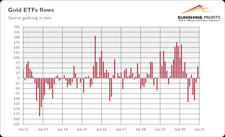 The survey results should always be taken with a pinch of salt, but the recent ETF flows confirm that there is still significant interest in gold. In June, the inflows to gold ETFs slowed down, as the chart below shows, but remained positive (+2.9 tons) despite the plunge in gold prices.