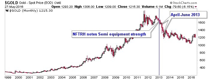 The plain and simple fact is that the Semiconductor Equipment sector is firming, with the April Book-to-Bill (b2b) joining Applied Materials’ quarterly report noted in NFTRH 396’s opening segment as another bullish [economic] indicator. Semi Equipment was a leader to the general Semi sector in early 2013, which in turn led the economy and job creation. Our fundamental gold view improved in January 2016 as gold launched upward vs. global stock markets, joining its positive status vs. commodities.