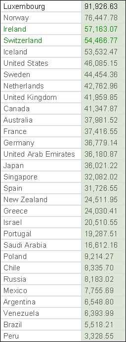 Obviously, these projections are very rough. Not all foreign currencies will rise in step and not all foreign GDPs will remain constant at today's levels in local currencies. However it is the concept that is important. Notice how America falls from 6th place to 21st. America's per capita GDP falls from 58% of Luxemburg's, the top nation on the list, to a mere 20%. America's per capita GDP falls from 14 times that of Peru, the lowest nation on the list, to only 5.6 times.