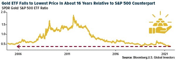 - Gold’s status as a precious metal is belied by its performance relative to U.S. stocks. Comparing the SPDR Gold Shares and SPDR S&P 500 exchange-traded funds shows as much. Monday’s ratio between the gold and stock ETFs was the lowest since September 2005, according to data compiled by Bloomberg. The ratio was down 44% from a March 2020 peak and off 78% from a record set 10 years ago this month.