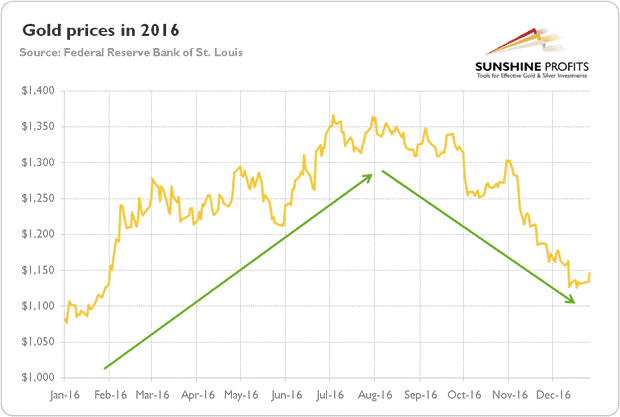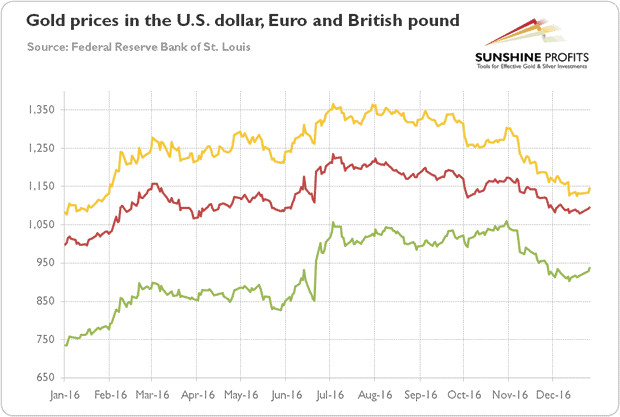 With the gloomy outlook after the Brexit vote and the uncertainty about the outcome of the U.S. presidential election, the future of gold was supposed to be rosy. However, nothing could be further from the truth. Since then, the shiny metal has been making lower highs and lower lows, with the one short-lived rally on election night. In December 2016, the price of gold dropped below $1,150, not a very distant level from the beginning of the year. Anyway, the yellow metal managed to gain about 8 percent in 2016. It is definitely an important improvement compared to previous bearish years (by the way, in the previous annual summary and outlook, we correctly predicted that 2016 will be better for gold than 2015), but gold's performance fell short of expectations based on the fundamental data. What is especially striking is that gold prices did not rally despite many potential catalysts, such as the Brexit vote, the Trump victory, the terrorists attacks in Europe, the geopolitical tensions in the Middle East, or the defeat of Italy's constitutional referendum.