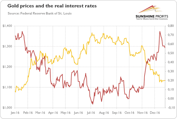 To sum up, the price of gold rose by 8 percent in 2016. Although it performed better than last year, all gains were made in the first half of the year. Indeed, gold was one of the best investments in the H1 2016, and one of the worst in the second half of the year. The stronger US dollar and rising real interest rates caused gold prices to fall like a stone in the fourth quarter of the year. It means that the bull market of 2016 has turned bearish, as market sentiment and macroeconomic conditions changed in the aftermath of the US presidential election. Hence, gold investors should focus on the above-mentioned factors, not on the geopolitics, gold reserves and annual balance between demand and supply. Will the bear market continue in 2017? It depends on the US central bank actions and market sentiment toward Trump's policies. If investors believe in stronger real economic growth and a more hawkish Fed, the greenback may strengthen, while the price of gold will decline further. On the other hand, if investors believe that Trump's will not accelerate growth but only inflation, while the Fed turns out even more dovish, the price of gold could catch its breath.