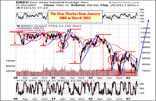 Here is a journal of the declines and rallies during the 2001 to 2003 bear market, shown above, using approximate numbers and dates: