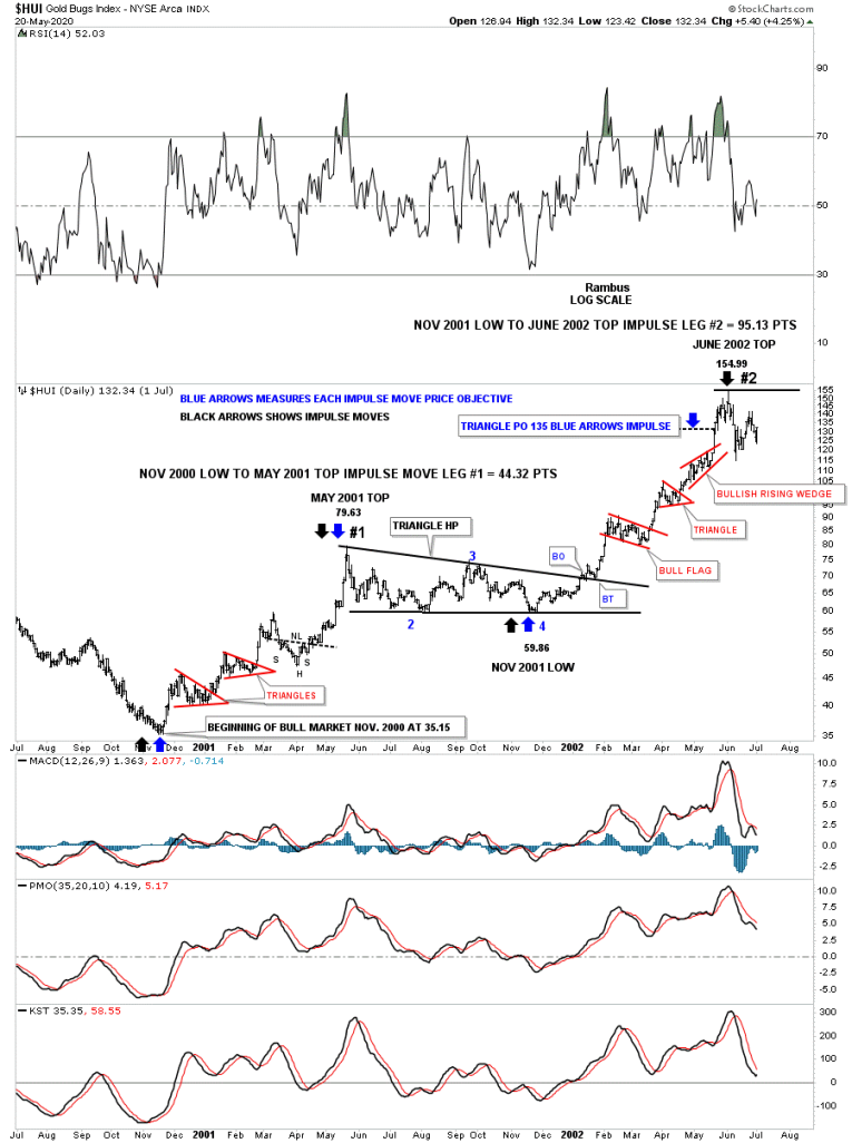 First let me show you the history chart for the HUI so you can see the consolidation patterns that formed during the 2000’s bull market. Each 4 point consolidation pattern has a red number on it so you can match up each consolidation pattern with the charts to follow. This is a general guide of how our current impulse move may unfold over the next many months.