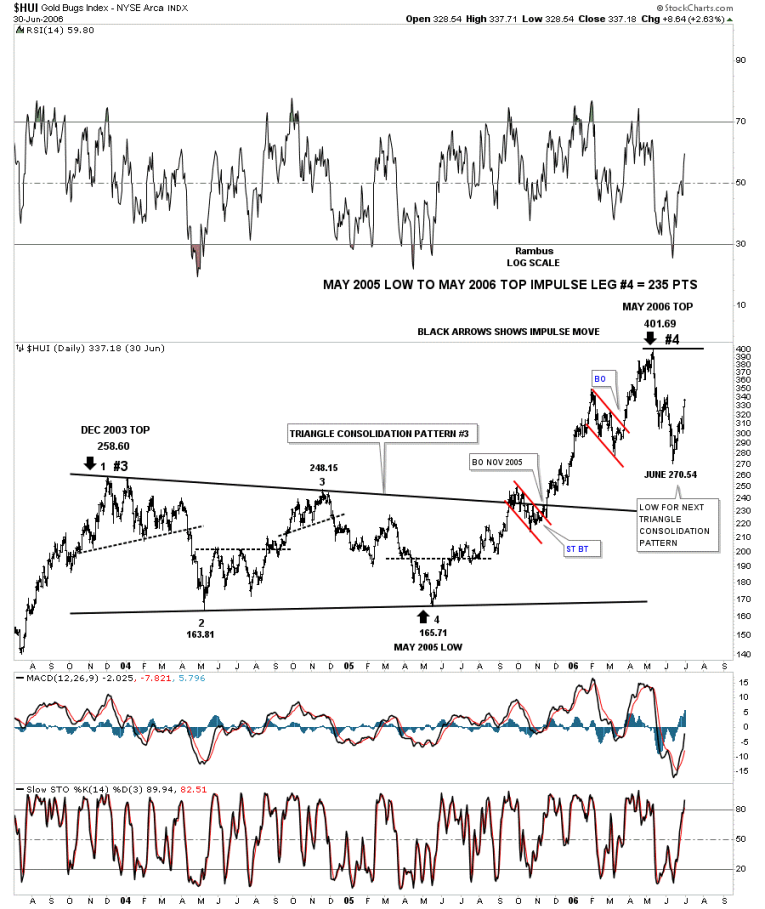 This next chart starts where the one above left off at the 2003 top. Here you can see the HUI built out another very symmetrical triangle to consolidate the previous impulse move. Again the impulse move began at the 4th reversal point. This impulse move completed 2 red consolation patterns before it finished moving higher. What you may have noticed is that each consolidation pattern is getting a bit bigger and each impulse leg is getting longer.