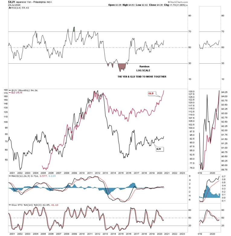 To see how well the GLD and the XJY track each other below is a long term monthly chart where I’ve overlaid GLD on top of the XJY. We are not looking for a perfect correlation but the similarities of the big trends.