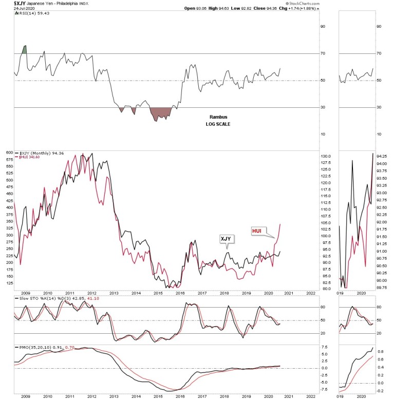 This next chart is a combo chart which has the XJY on top with the HUI on the bottom. Looking at the brown shaded area as a whole you can see how these two basically had the same bear market in time. Here again you can see how the HUI has already broken out and backtested the top rail of its 2016 five point triangle reversal pattern while the XJY is just now attempting to breakout from is own 2016 triangle. This combo chart also shows you how the XJY and the HUI tend to move together.