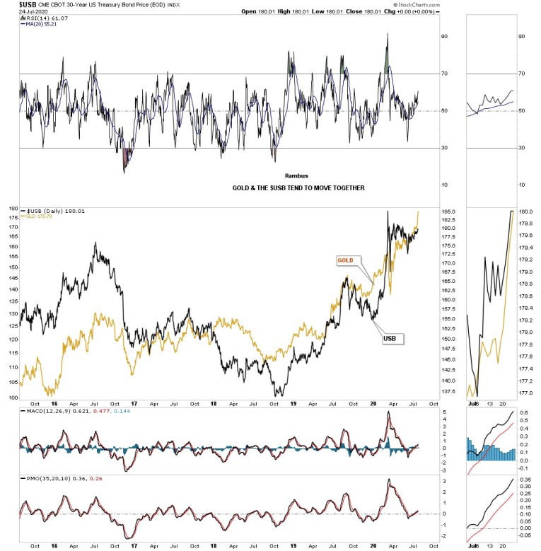 This next chart shows a pretty close correlation between the USB 30 year bond and the price of gold.