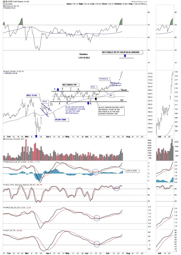 I would like to finish up by looking at 2 price objective charts, one for GLD and the other for Silver. This first chart for GLD makes sense from a Chartology perspective as it has some classic chart patterns. Starting at the March 23rd low which is the beginning of our current impulse move the first consolidation pattern that formed was the blue bull flag that formed roughly in the middle of the initial leg up to the first reversal point in the black 6 point rectangle which I’ve labeled as a halfway pattern. The blue arrows show the impulse method for a price objective which is up to the 189.89 area.