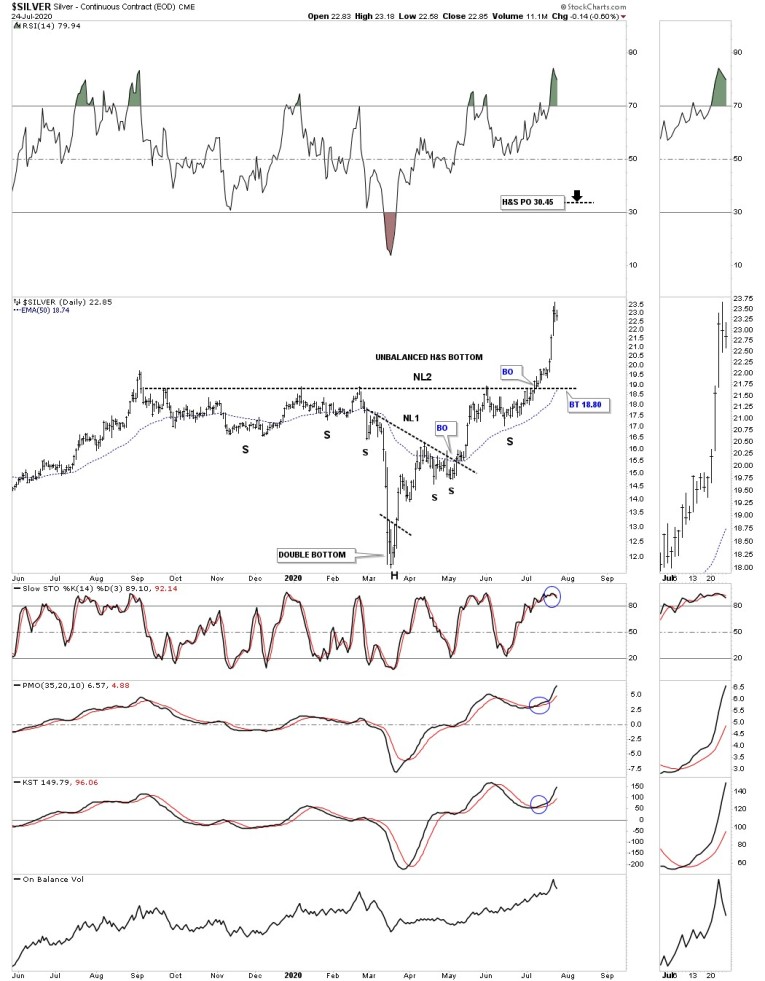 Below is a daily chart for Silver which is showing us an unbalanced H&S bottom with 2 necklines. The price objective for NL #2 is up to the 30.45 area.