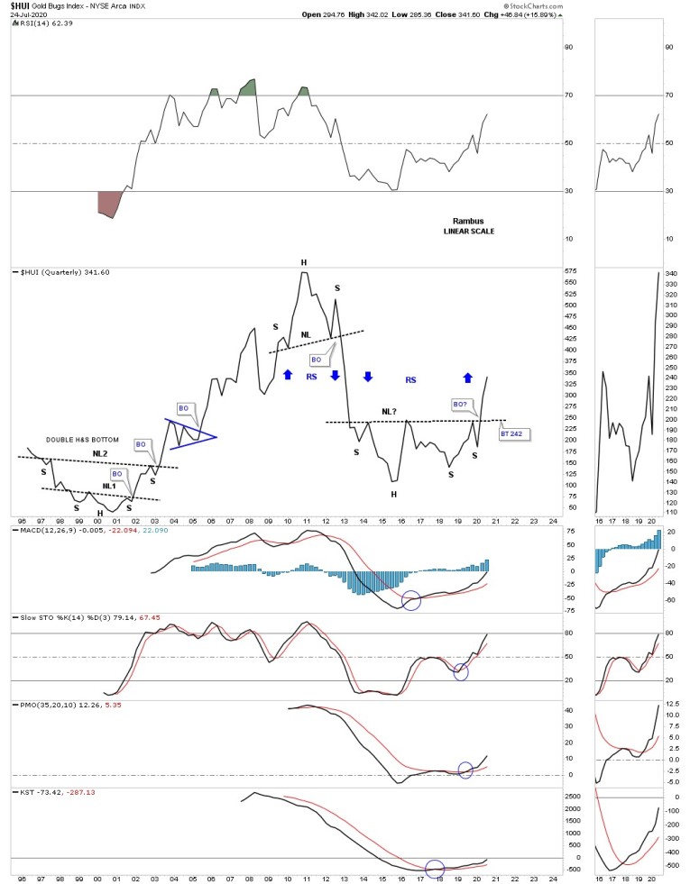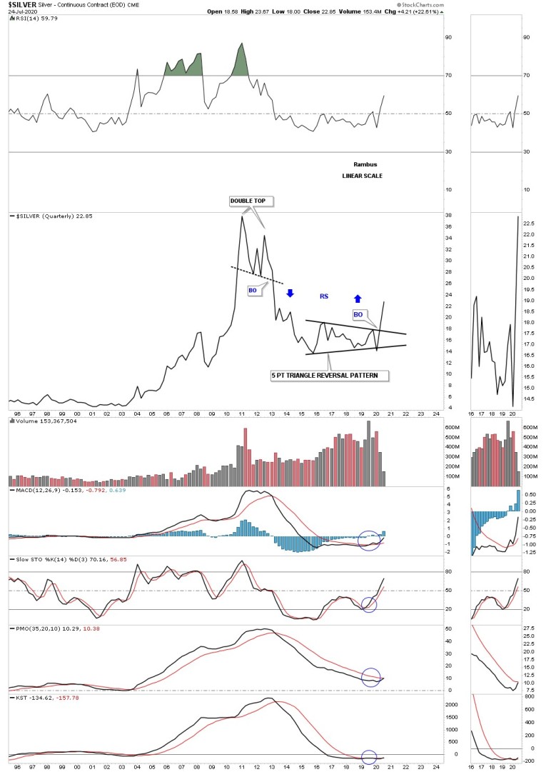 If there was only one chart I could use to make a case for the PM complex bull market it would have to be this quarterly line chart for gold. First note the beautiful and symmetrical H&S consolidation pattern we followed in real time and the reverse symmetry over the same area on the way down as shown by the blue arrows. On a quarterly time basis you can see gold is trading at new all time highs. The last thing to observe is the 2000 to 2011 bull market which made higher highs and higher lows on a quarterly basis.