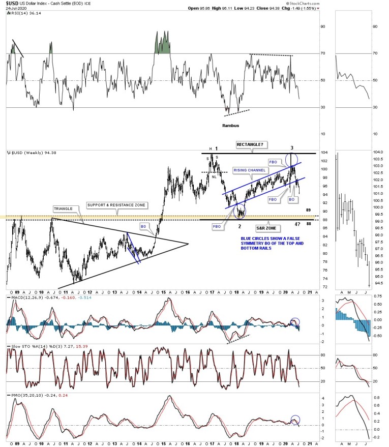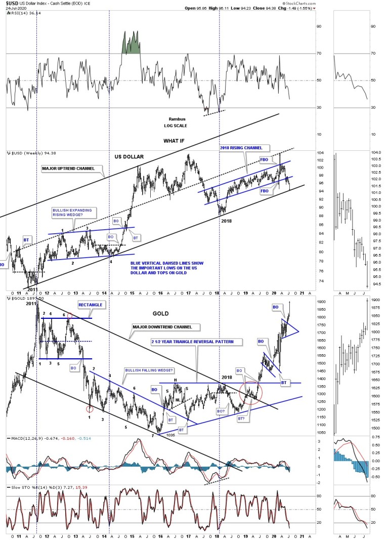 Lets look at a combo chart which actually shows what the USD and gold have done since gold peaked at 1920 in September of 2011. As you can see the USD has enjoyed an almost 10 year uptrend channel while gold was stuck in its downtrend channel until it broke out above the top rail of its 2011 bear market downtrend channel in January of 2019 where the two have been moving somewhat together until recently, red circle. Note how the US dollar is trading right on top of its 2011 bull market uptrend channel. It’s possible we could see a small bounce off the bottom rail before breaking through to the downside. That bottom rail on the US dollar is the most important trendline on the planet as it will affect so many other areas like the PM complex, commodity complex, and most of the important currencies in the world.
