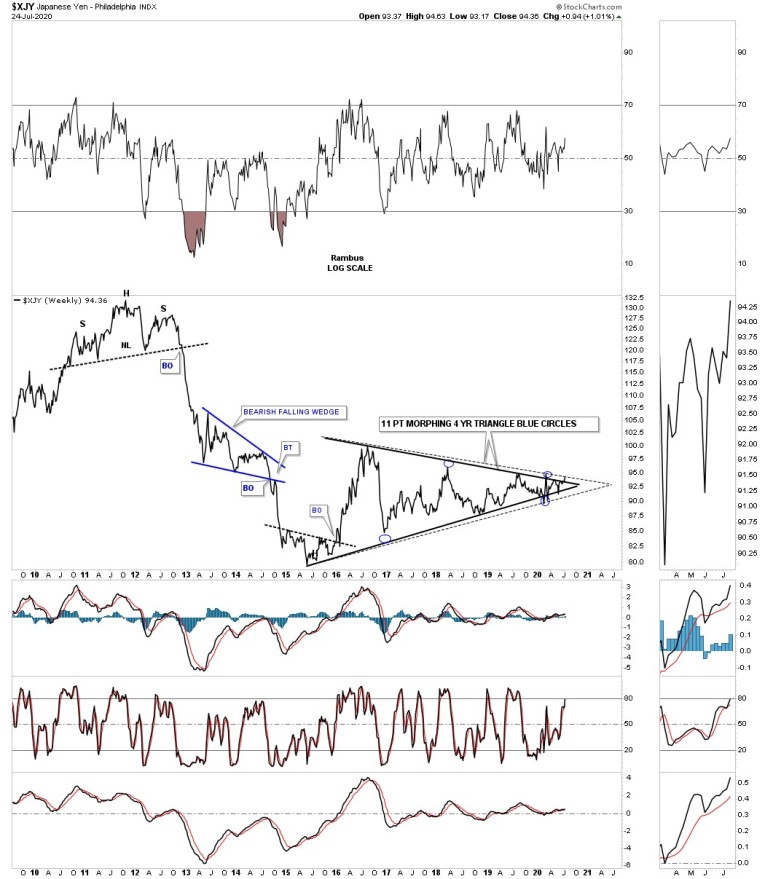 The XJY has been building an 11 point triangle that began to form in the middle of 2015. The 2 sets of blue circles show how the original triangle has morphed into a slightly bigger triangle as shown by the black dashed trendlines. A breakout above the top rail would be very bullish long term for gold.