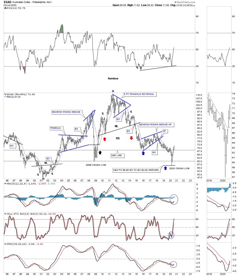 This long term monthly chart for the XAD, Australian dollar, just recently reached the H&S price objective at 56.50 using the breakout to breakout method using the bearish rising wedge as a halfway pattern. Since the H&S top price objective has been met could we see a rally similar to the one we saw back at the 2009 crash low?