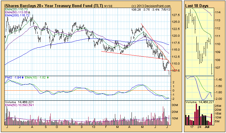 Last week TLT, our bond market surrogate, made a new low, then bounced up to the resistance of the declining tops line drawn from the May top. It turned down on Wednesday, we thought beginning a move to test the recent low, but today TLT didn't bother to retest the low. It gapped down below the support and kept heading south.