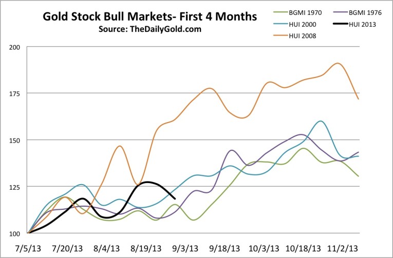 The HUI (essentially a GDX with less holdings) remains well in-line with our projected recovery. The projection is the amalgamation of four recoveries (1970, 1976, 2000, 2008) starting from the current bottom. The HUI is in blue while the projection is in red.