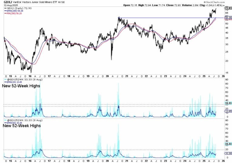 Below, we plot the 20-day exponential moving average of new highs in GDXJ and the 50-day exponential moving average of those new highs. The EMAs of new highs are at 13.8% and 10.4% respectively.